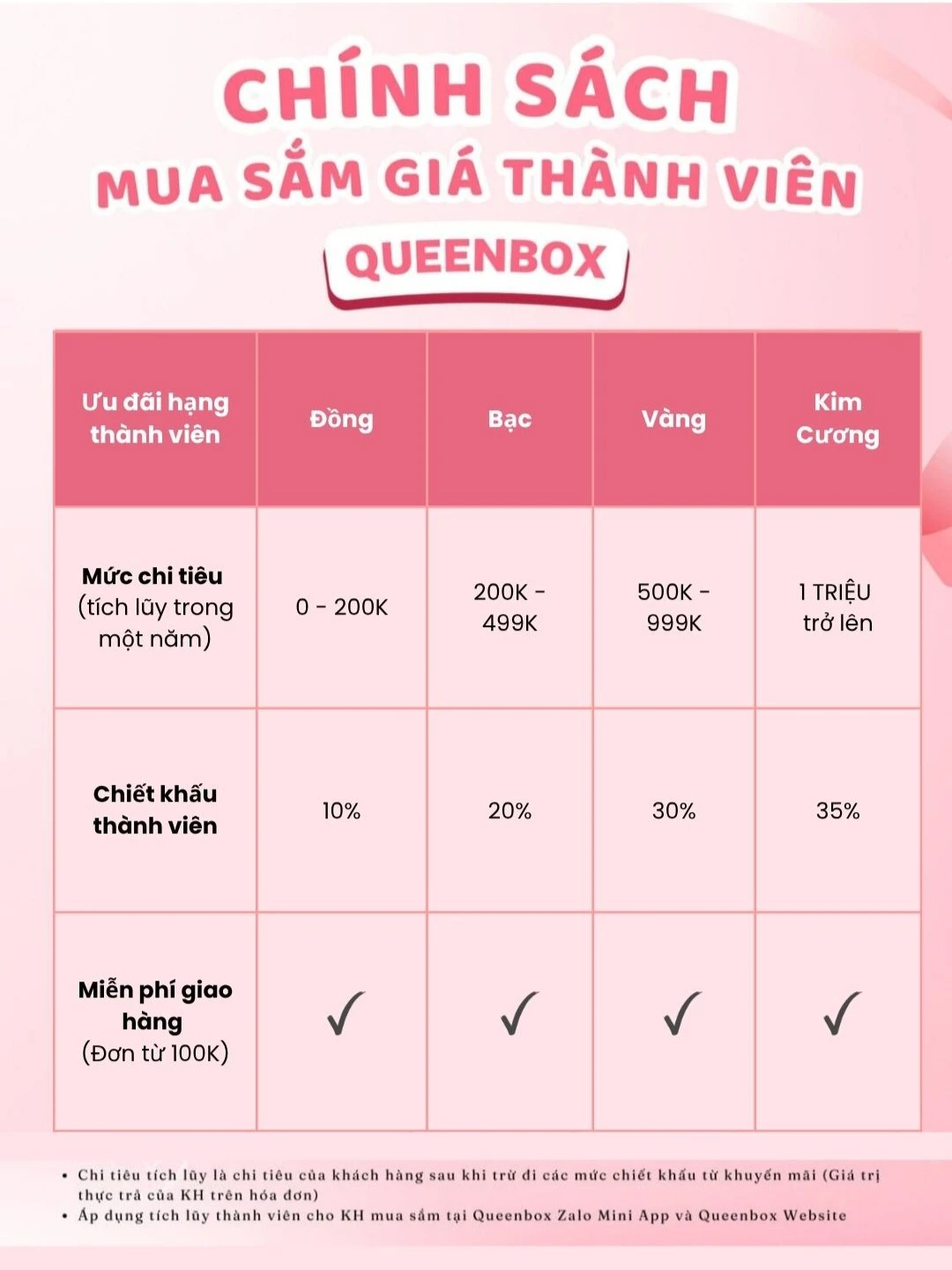 * Lưu ý: Hạng thành viên sẽ tự động thăng cấp tùy theo mức chi tiêu của mỗi khách hàng – Hạng mức ưu đãi sẽ được áp dụng trọn đời mỗi khi mua tại Web Queenbox.vn hoặc Zalo Mini App Queenbox Vietnam.
