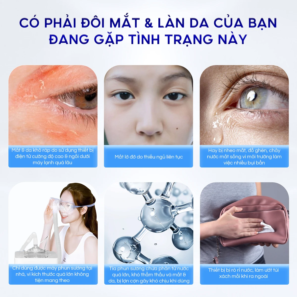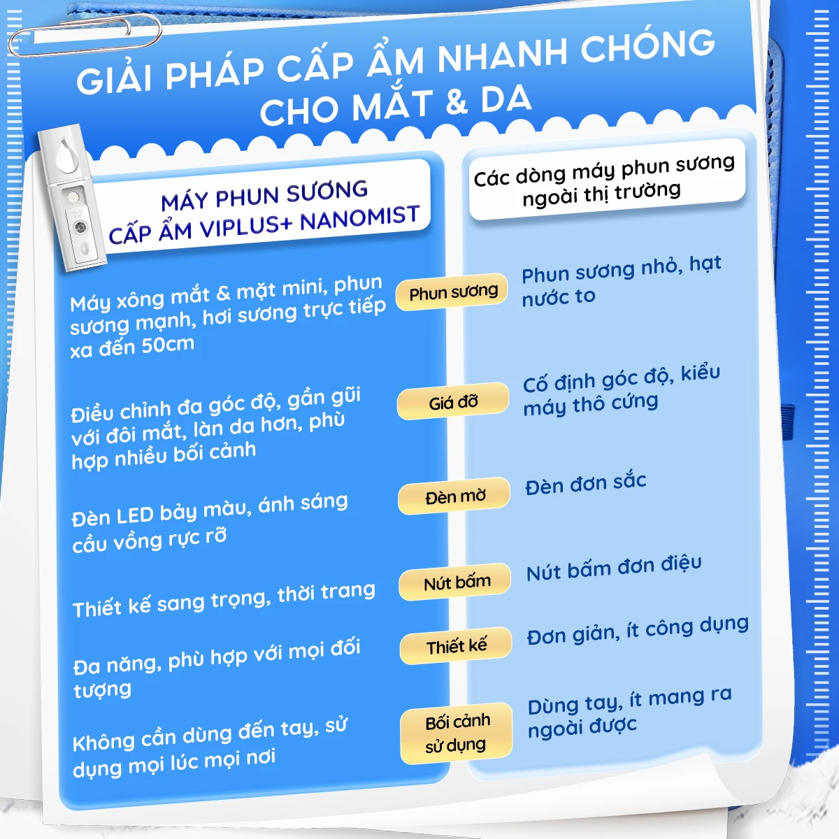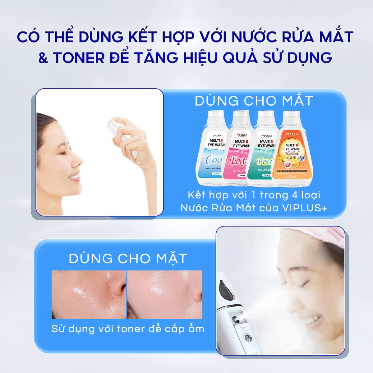 – Máy phun sương VIPLUS+ Nano Mist Sprayer cung cấp độ ẩm tức thì cho mắt và da.